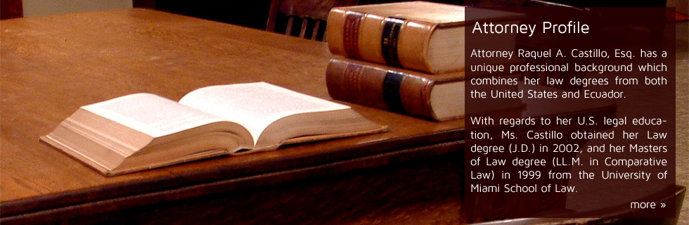 Attorney Raquel A. Castillo, Esq. has a unique professional background which combines her law degrees from both the United States and Ecuador.  With regards to her U.S. legal education, Ms. Castillo obtained her Law degree (J.D.) in 2002, and her Masters of Law degree (LL.M. in Comparative Law) in 1999 from the University of Miami School of Law.