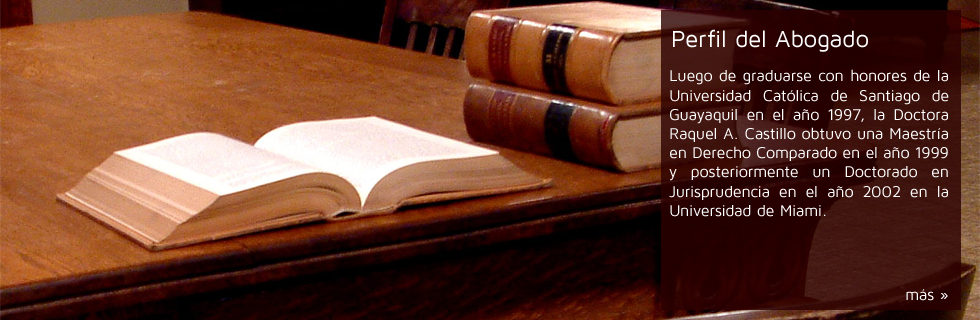 Luego de graduarse con honores de la Universidad Católica de Santiago de Guayaquil en el año 1997, la Doctora Raquel A. Castillo obtuvo una Maestría en Derecho Comparado en el año 1999 y posteriormente un Doctorado en Jurisprudencia en el año 2002 en la Universidad de Miami.
